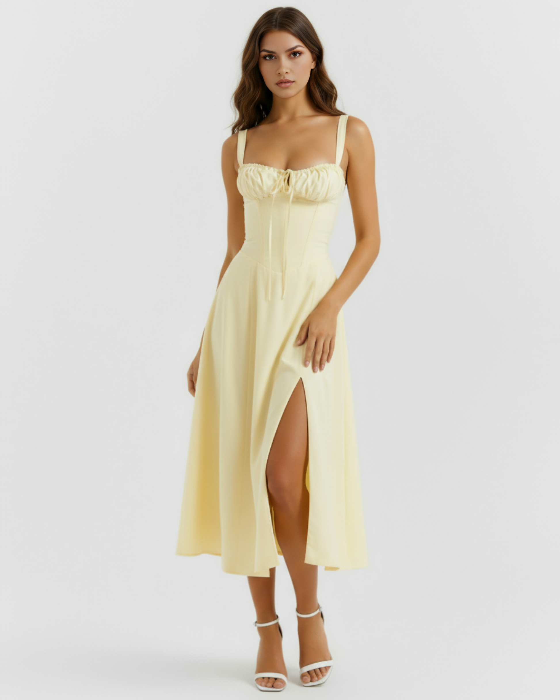 Te sentirás ultrafemenina con nuestro vestido "Aurora", perfecto para fiestas en el jardín de primavera y verano. Está confeccionado en algodón elástico con un precioso botón de oro y cuenta con un corpiño con corsé que lo ajusta con una preciosa espalda con cordones. El busto fruncido se ata con un cordón y la abertura lateral le aporta un toque sensual, dejando ver un poco de pierna.