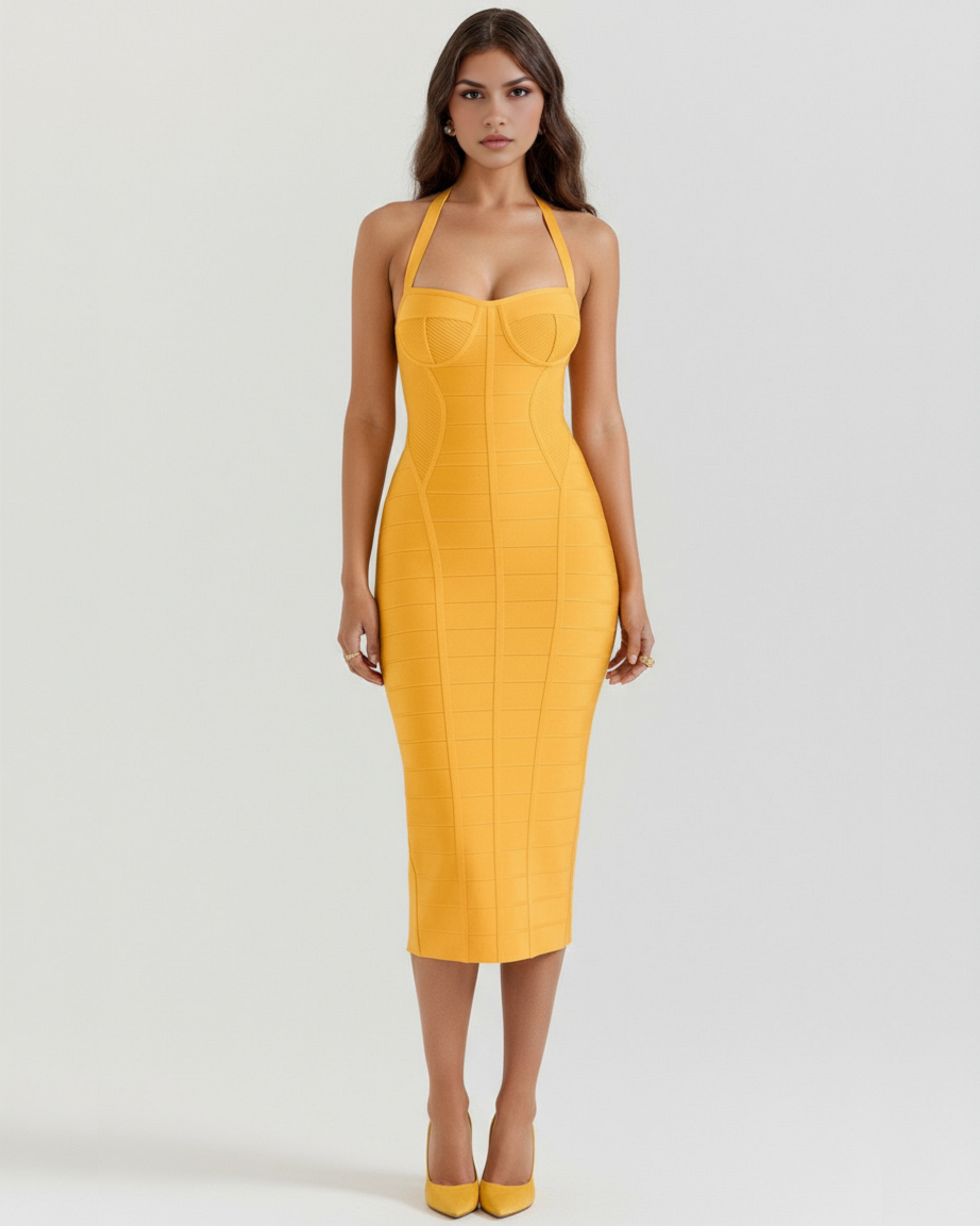 Ya es oficial: el vendaje está de vuelta. Te presentamos Cleopatra. Confeccionado con tejido vendaje grueso, se adapta a tu cuerpo y realza tus curvas, mientras que los tirantes halter y la espalda escotada añaden un toque de sensualidad. El elegante largo midi completa esta silueta irresistiblemente sexy.